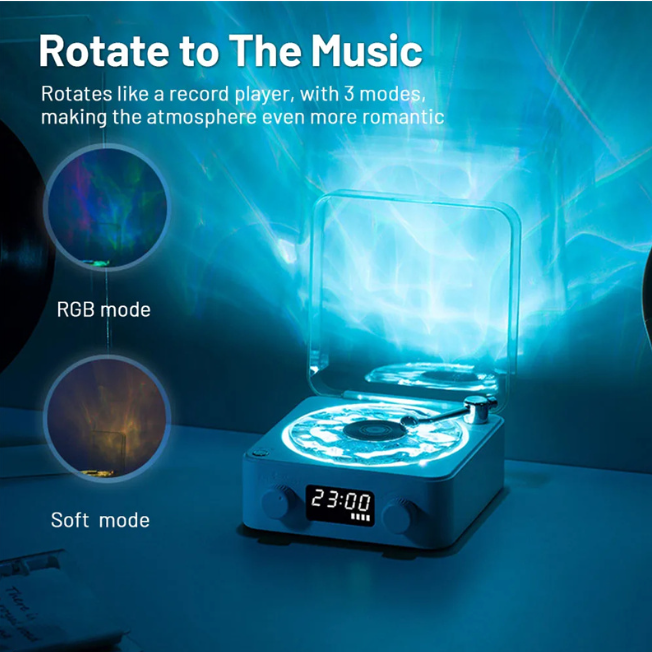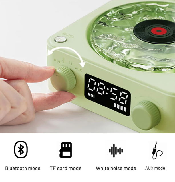 Enjoy versatile music playback through Bluetooth, AUX, or TF card while the speaker’s beautiful water ripple turntable adds a relaxing, ambient light effect to your space.