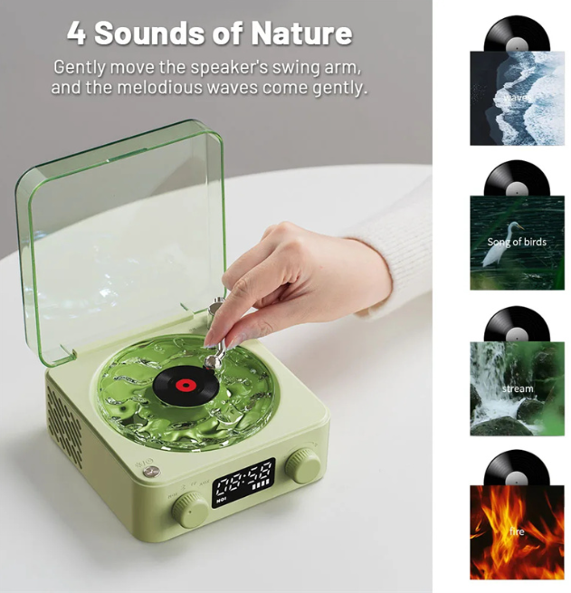 ✧ Breathing Light Effect: Transparent rotating water ripple turntable creates a beautiful ambient lighting effect that adjusts to the music. Non-dazzling at night with screen-off design and touch/vibration wake-up feature.